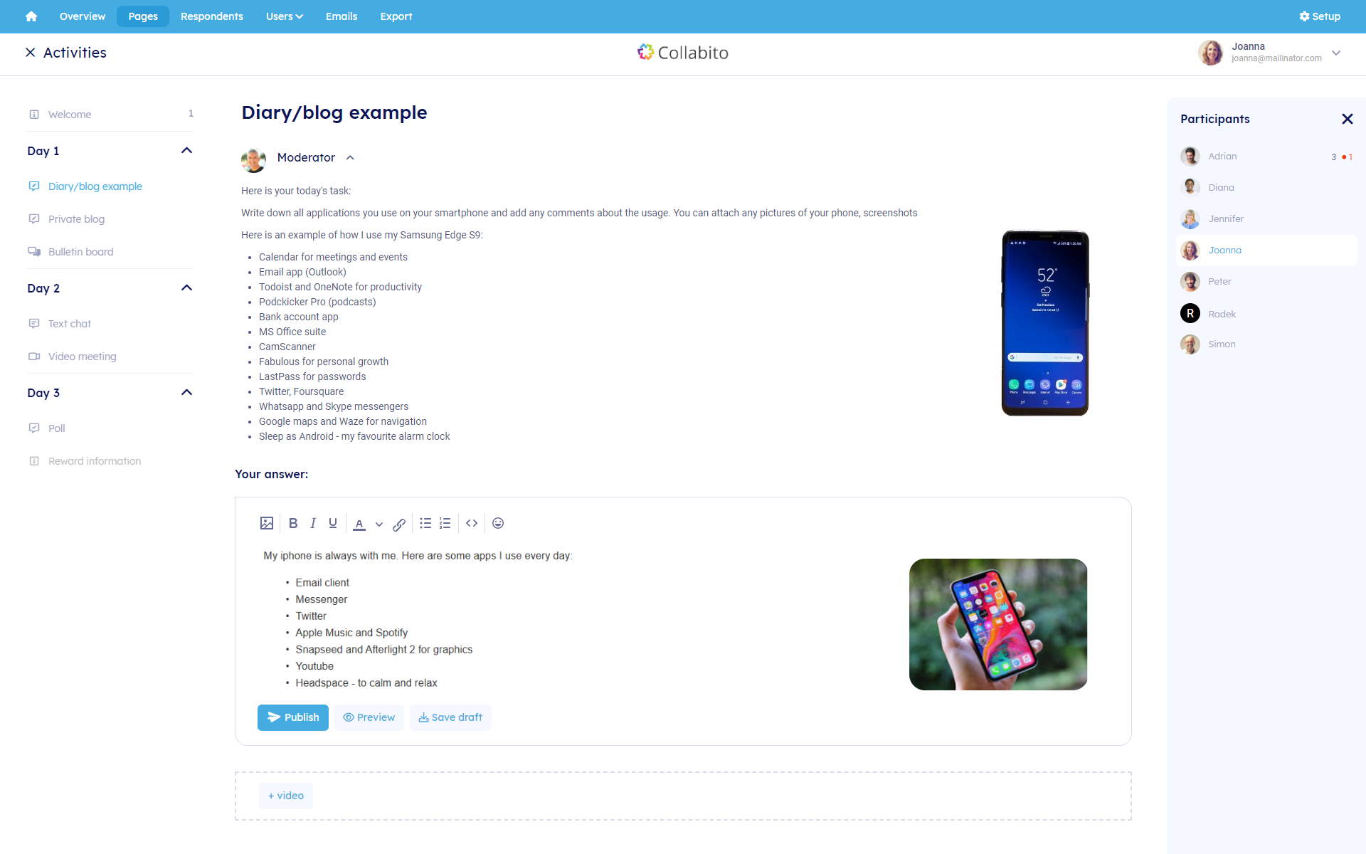 Let your respondents create their own blogs. Other participants can read the articles and comment on them immediately after publishing. You can create many topics within one project so the moderator can give for instance new task each day. Main features of research blogs:
